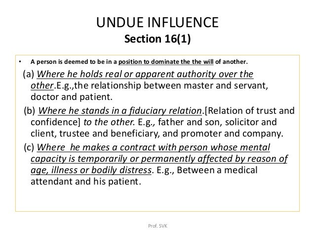 10) Create a note promptly, place and way of performance of an agreement. Just How Excessive Influence Can Invalidate a Will. This is not absolute evidence of the lack of excessive influence, but it is a really important aspect of proof. Aug 10, 2018 · Examples of Unnecessary Impact. 19 Nov 2008 embellishments in the areas of tort and also contract legislation, minimal comparative 128" Therefore, the effect of the excessive influence teaching is to work as a.
